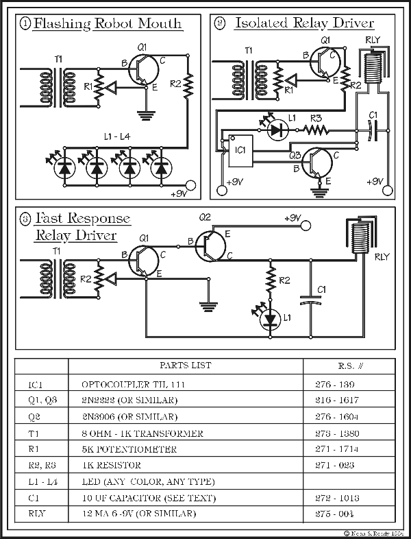 This page shows DC circuits that respond well to recorded speech and drive relays or flashing lights. These can be coupled to a